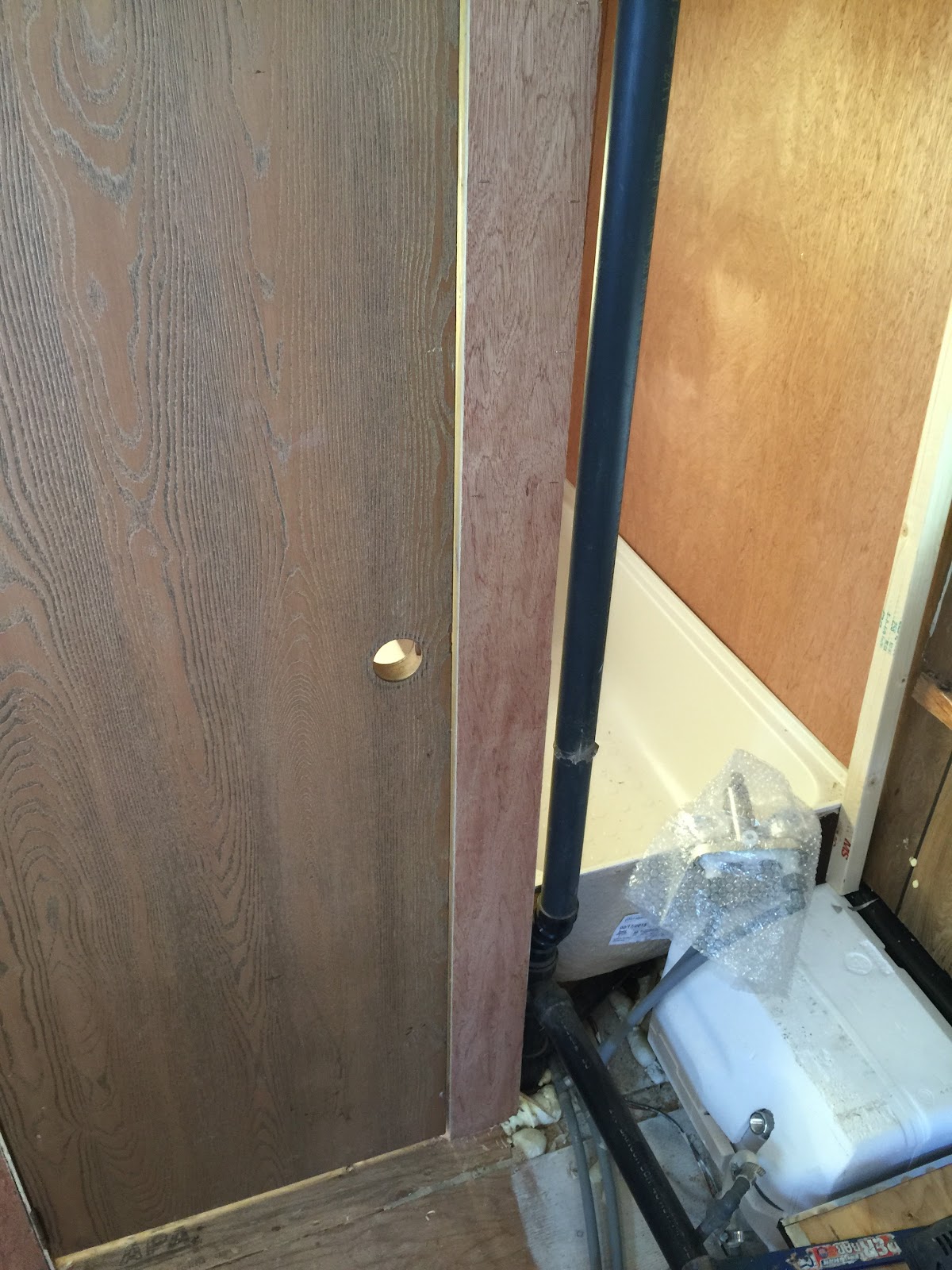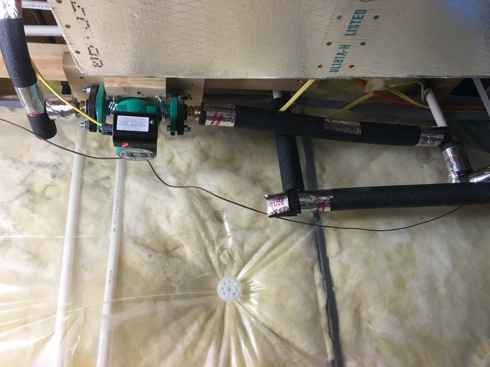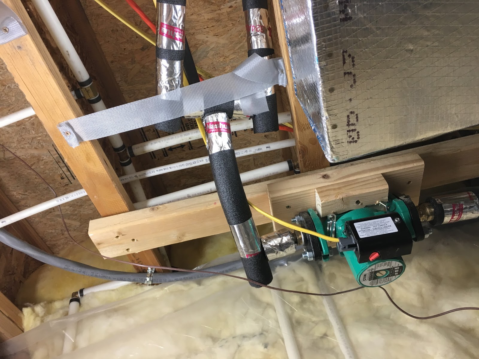 Here is the final picture. I added insulation to as much of the hot water piping as I could. I mounted the pump to a block of wood which I screwed into the joists.