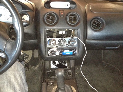 I had to make a custom bracket to mount the head unit to. I happened to have the factory mounting brackets from a 1st gen Eclipse. You can see one of the four spot welds I made in this picture. You could just drill through and bolt them together if you don’t have a welder. The donor bracket was contoured almost perfect to slide into the contours of the factory bracket.